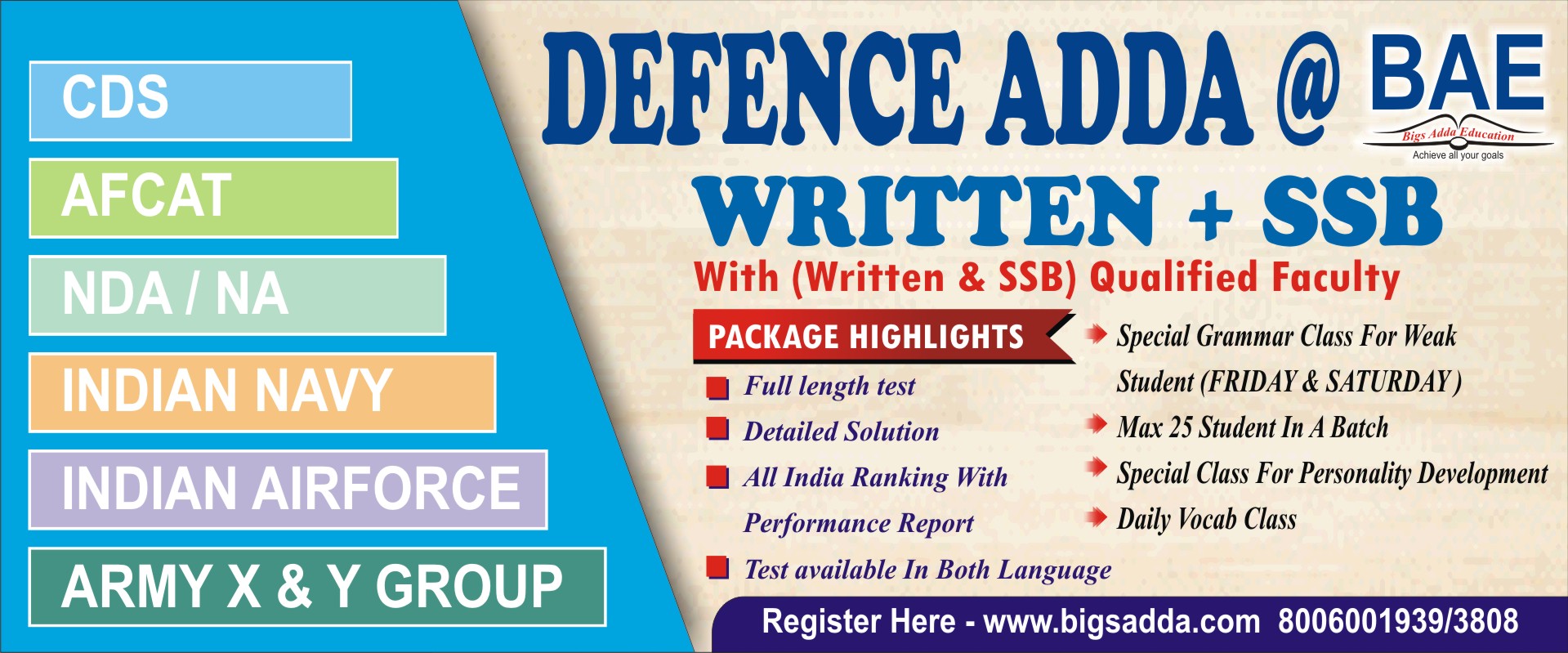 COURSES : NDA, AIRFORCE X & Y GROUP, NAVY, CDS and AFCAT , SSB interviews and Personality development ,